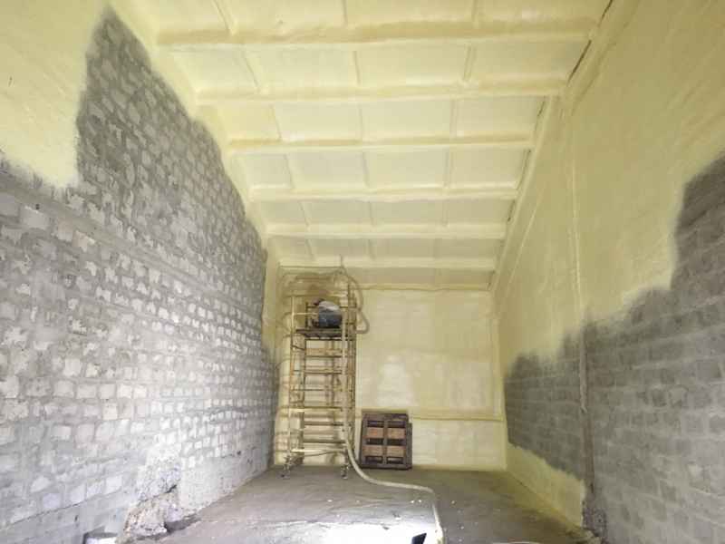 Нанесення ізолюючого шару пінополіуретану на стіни, підлогу і стелю відбувається методом напилення, тобто утворюється монолітний і повністю герметичний шар термічного бар'єру. Причому теплоізоляція стелі холодильної камери з пінополіуретану не вимагає яких-небудь особливих підготовчих заходів, оскільки даний матеріал володіє чудовою адгезією практично до будь-яких поверхонь, заповнюючи собою всі щілини, тріщини та виїмки. В залежності від конструкції, поверхні та температурного режиму що вимагається, пінополіуретан можна замовити різної щільнотсі. Так щільність ППУ для стін і стелі холодильної камери становить від 40 кг/куб. м, щільність пінополіуретану для підлоги від 45кг/куб. м. Причому фактичні показники повністю відповідають заявленим, оскільки в своїй роботі ми використовуємо компоненти для напилення провідного виробника ЄС марки Purinova, що відрізняються найкращою якістю, а також найсучасніше високотехнологічне обладнання високого тиску Graco США.