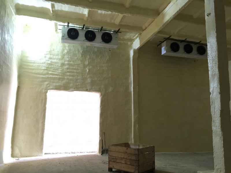 Але оптимальними є перевірені рішення термомодернізації вже існуючих капітальних будівель та споруд пінополіуретаном. Це набагато швидше та дешевше, не потрібно розробляти та затверджувати проекти на будівництво, не треба підводити нові комунікації, виробляти ТУ на електропостачання, достатньо по існуючих конструкціях напилити потрібний шар теплоізоляції ППУ щільністю 40-60 кг/м.куб, та залити підлоги відповідно до технологічного процесу та планів експлуатації, змонтувати необхідне холодильне обладнання, ворота і все: овочесховища, промислові холодильники чи камери шокової заморозки чи камери тривалого зберігання готові до експлуатації.